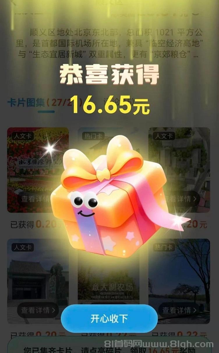 哇区是简玩旗下新产品,不出门就可以解锁全国各地旅游打卡,每解锁一个区都能领到十几20不等【哇区】一部手机游历全国边玩边赚这是简玩旗下新出的广告保底游戏以集取碎片点亮城市为目标让你不必远行也能历遍河山零撸保底+碎片广告玩法最低0.2-74简玩大公司出品。解锁一个碎片看广保底0.2-0.4解。锁一个区12个碎片10-30,解锁一个市6个区集满20-74。解锁20个景区额外奖励100满0.3可提秒到微或支每获得一张新卡都会有奖励每解锁单个景区都会有奖励