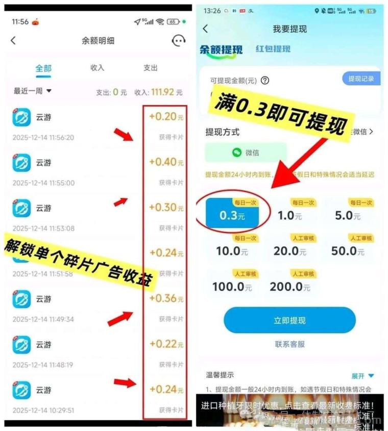 现在这个平台刚出首码每个包都是0.2-0.4元且满0.3即可提现都是秒到。看完一轮(大概20多个广告)可得20-80元。