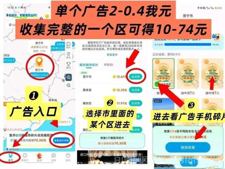 进入首页后--点击下方【查看城市详情】随便点一个【去点亮】--进去直接看广告会获得随机碎片价值0.2-0.4元。