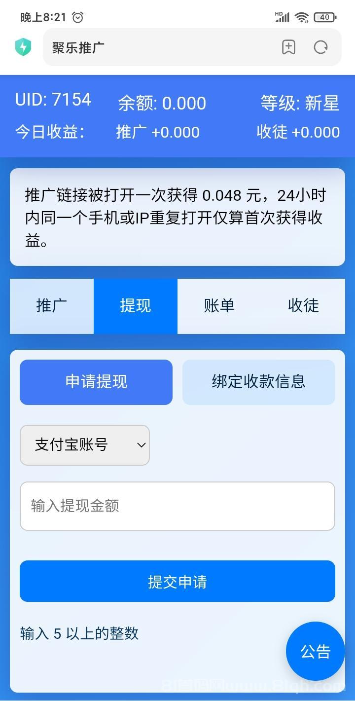 正文 聚乐影视点击赚米,1元起某付宝提取零手续费 首码联盟 V评论者 /今天 /0 评论 /478 阅读 0101 文章最后更新时间2026年01月01日,若文章内容或图片失效,请留言反馈! 聚乐影视首码,老牌转发文章出品,类似之前的八戒传媒,自己点或分享好友都行,一次点击0.48元;100次妥妥到手48元,推广5代收益层层叠加,收益来源稳定可靠,已测到账,1米就能快提现稳。聚乐影视项目特色:可一键托管,无需任何操作,影院与影视出品公司实时结算,实实在在的收益每天*自动到达你的账户,1元起某付宝提取,零手续费。0.48元×点击次数:自己点或分享都行,例如100次48元到手,稳拿。5代推广日入百米:分享好友?代收益,浏览器扫码秒注册,到账快,早分享早躺平赚。 版权声明:本文内容由互联网用户自发贡献,该文观点仅代表作者本人。合作之前建议签订合同,本站仅提供信息存储空间服务,不拥有所有权,不承担相关法律责任。请勿盲目下载注册。若您不同意该提示,请关闭网页且不要在本站拓展任何合作,否则造成的任何损失由您个人承担。如发现本站有涉嫌抄袭侵权/违法违规的内容, 请发送邮件至:1442121520@qq.com