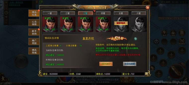 佣兵搬砖玩法 只要激活佣兵,每天一键扫荡,就可以卖心法赚米,不需要花时间玩游戏,适合懒人玩法
