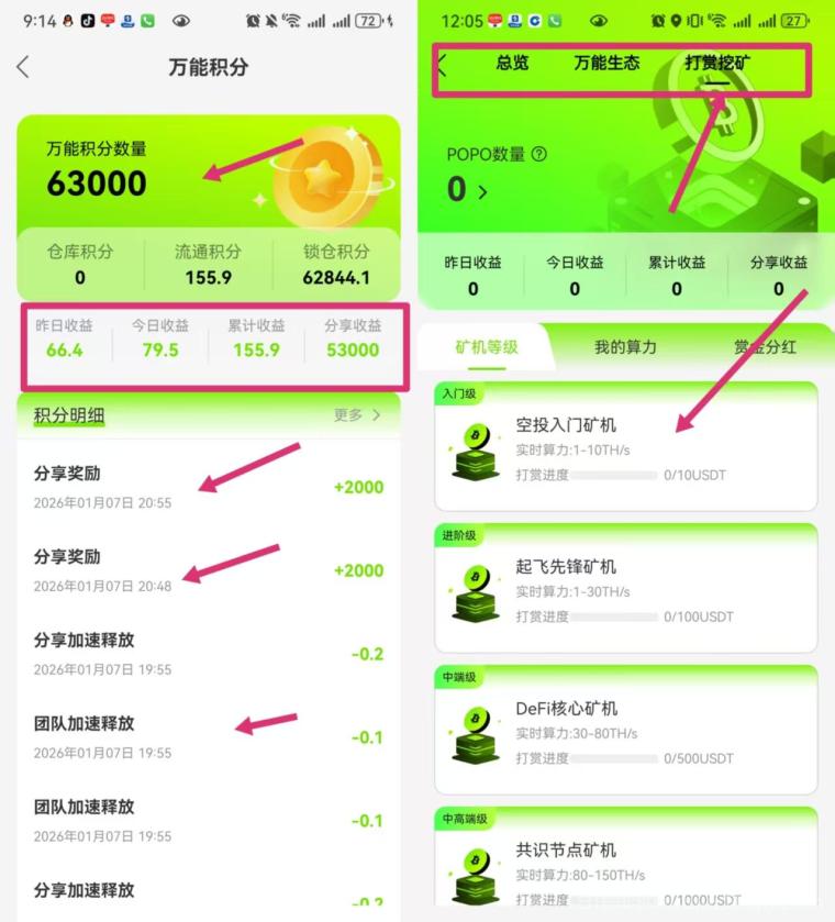 把邀请码甩给10个好友,系统立刻发福利矿机,24小时自动产积分,日产200-300,折合2-3元,矿机永久有效,不耗电不占内存,后台挂着就行。好友再推人,你拿二代5%积分加成,层层叠上去,号越多矿越多,早十天上车,积分池天天涨。