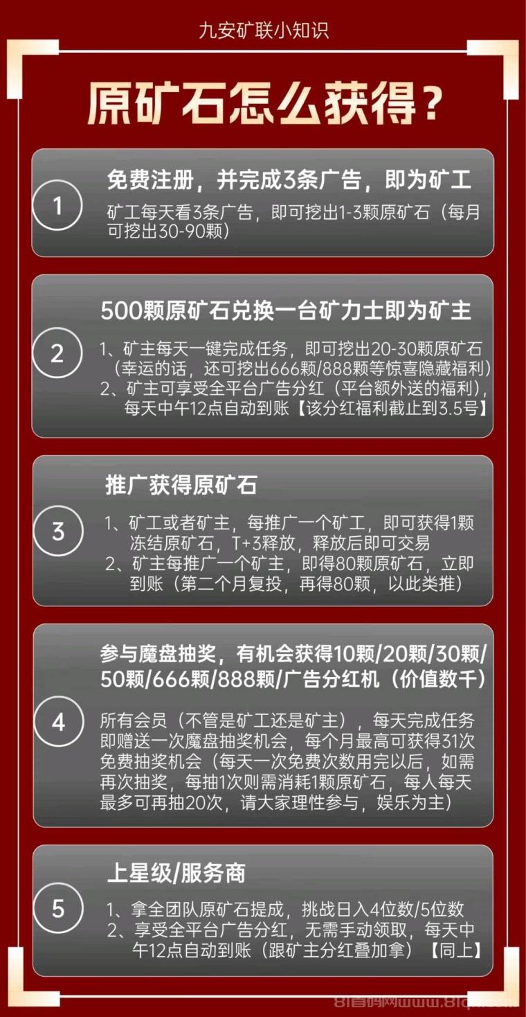 邀请即送原矿石,注册每日完成简单广告任务,即可稳定产出原石,上线幸运抽奖转盘