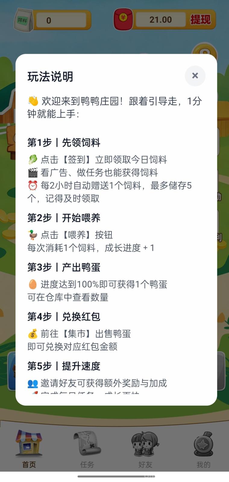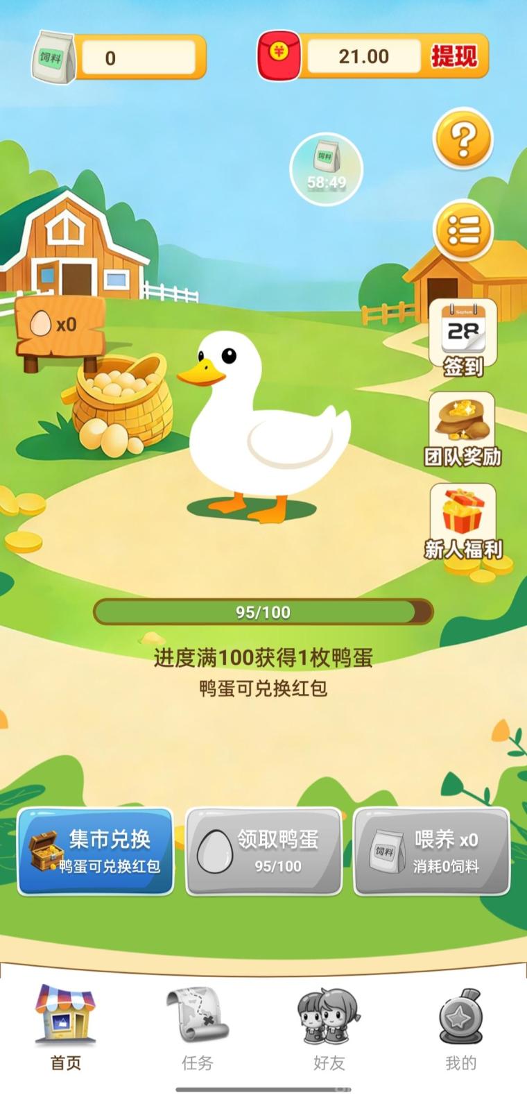 鸭鸭庄园刚上线,玩法设计简单直接。核心资源是饲料,通过多种途径获取饲料兑换现金收益。每日完成基础任务加观看10个广告可领10饲料,折合1元。系统自动产出饲料气泡,每2小时生成1饲料,24小时累计12饲料价值1.2元。