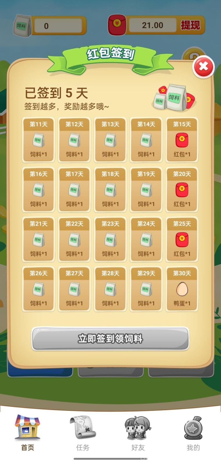 每日签到送饲料,连续签到每满5天额外奖励1元。月度签到满30天送鸭蛋一枚,价值10元。每日分享任务可再得1饲料。多种渠道叠加,饲料产出稳定可预期。