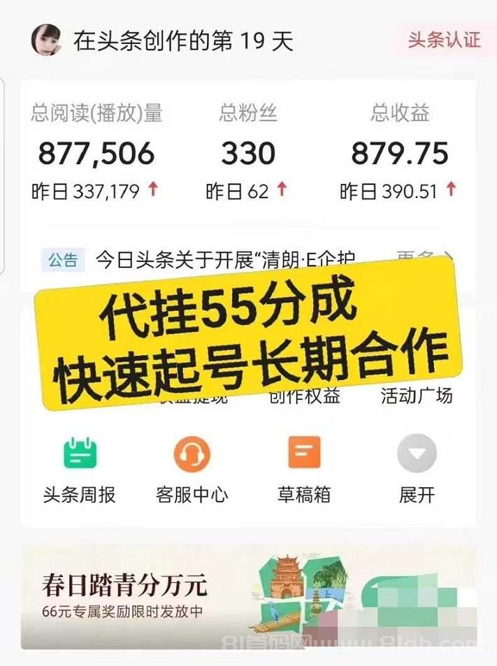 久久尖职首码上线:2026年今日头条免费代运营项目,收成对半分全程零费用,每周四直接提现到账