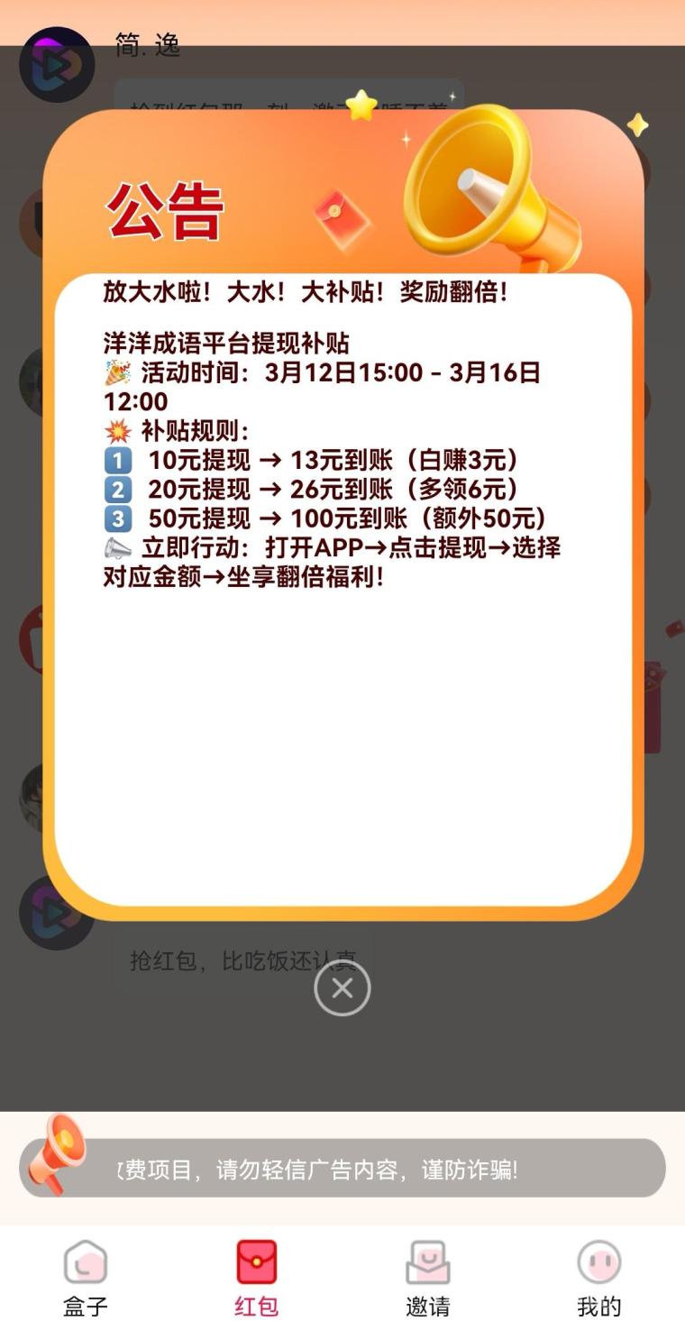 洋洋成语高补贴活动新包:最高补贴50%看一个广告1000到20000金币,提50到账100元