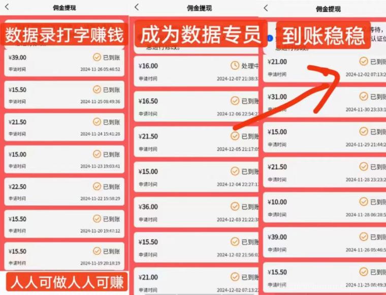 数据录是超级暴力零撸平台,人人可做每天打字赚米。每天需打卡后才可进行录入文字,每次金额0.3到0.5元不等,每天保底10到50元,提现稳已到账几百块。
