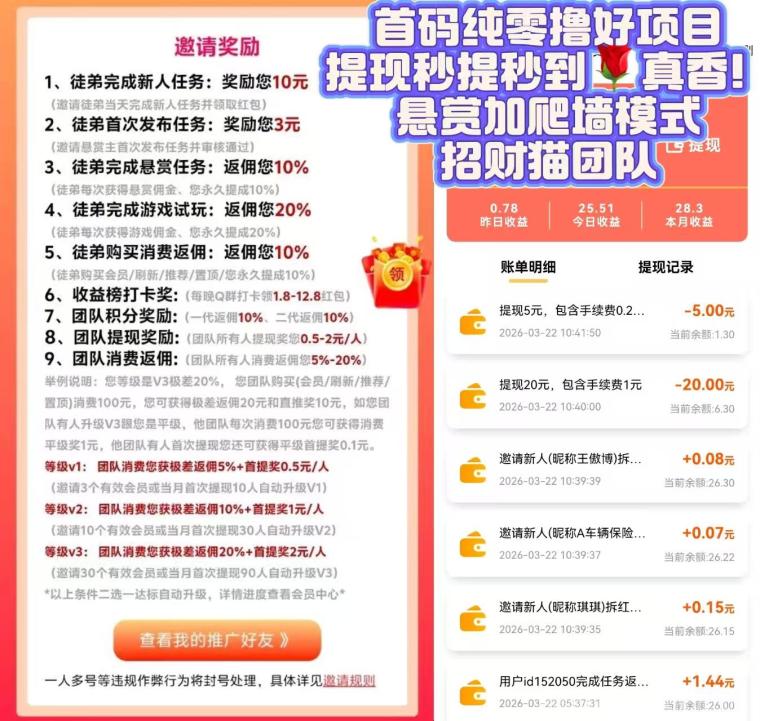 正文 趣任务体验:悬赏任务加爬墙轻松赚,单机每天10~50+ 店流宝 V评论者 /今天 /0 评论 /508 阅读 0323 文章最后更新时间2026年03月23日,若文章内容或图片失效,请留言反馈! 首码零撸已上线🧵🧵💰长期稳定!新出爬墙加悬赏做任务玩法,推荐!趣任务,3米一个,星途爬墙模式。不用刷脸,支付宝授权即可认证两代推广收益,每一个月减产1次(10%)。卖出规则:3出1(1个积分可以兑换50贡献值,卖出需要100贡献值)。1️⃣爬墙得积分:1积分=3米可兑换可交易,3月25日全阶梯开放悬赏拿佣金:每日排行前20,官方Q群打卡享每2️⃣日分红!无门槛参与,满1米秒提现4️⃣升级成为代理,邀请好友进平台,每个得0.6元收益,好友消费再拿65%消费佣金!满10即可提现(⌐■_■)💰注册地址【趣任务Pro】拿着手机做赏金任务,在家躺赚零花钱服务V:MangGuoMoXiong 版权声明:本文内容由互联网用户自发贡献,该文观点仅代表作者本人。合作之前建议签订合同,本站仅提供信息存储空间服务,不拥有所有权,不承担相关法律责任。请勿盲目下载注册。若您不同意该提示,请关闭网页且不要在本站拓展任何合作,否则造成的任何损失由您个人承担。如发现本站有涉嫌抄袭侵权/违法违规的内容, 请发送邮件至:1442121520@qq.com
