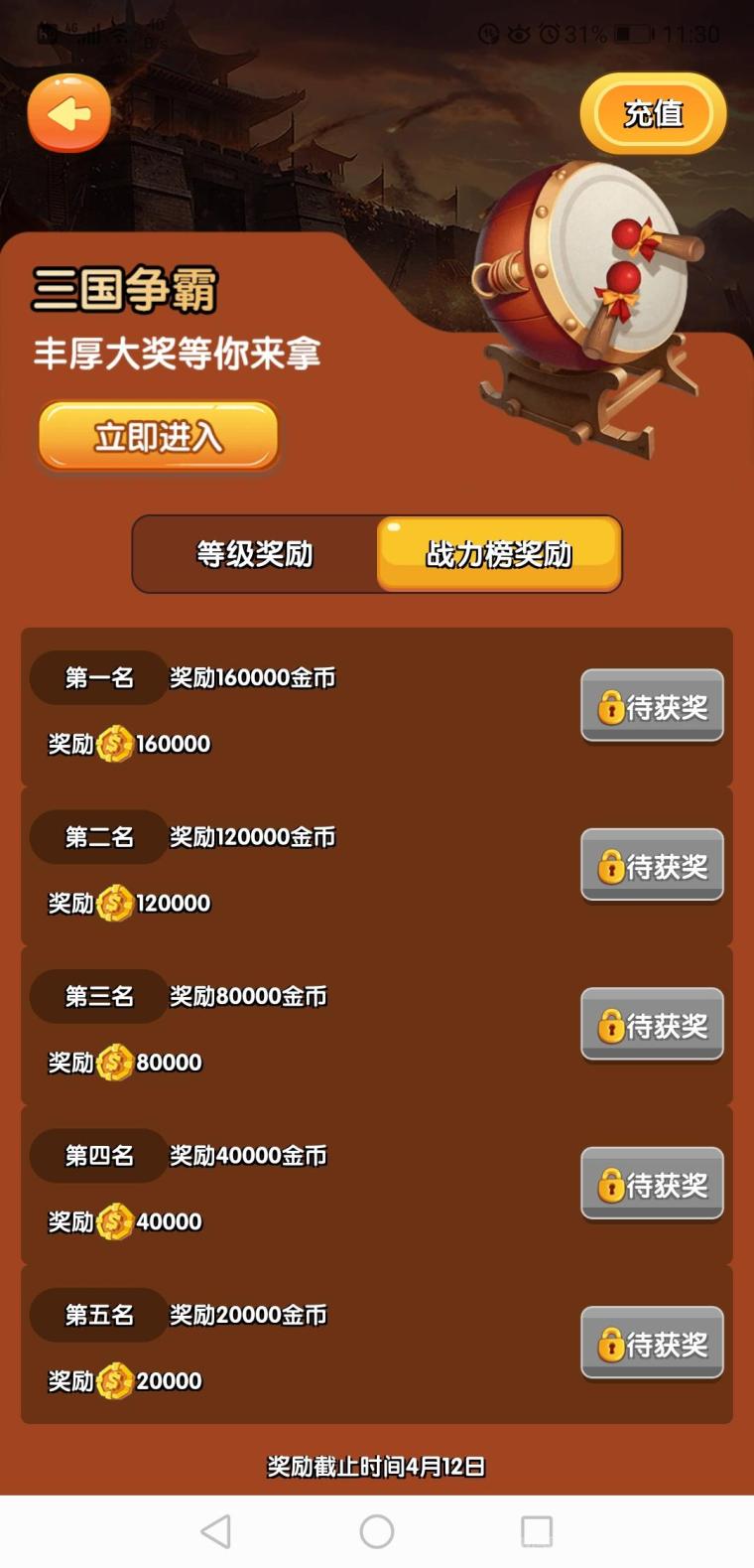 第三个是玩三国争霸,等级提升可以获得大量金币,进入排行榜能获取大量金币,是一个回合制的小游戏,有玩法引导,傻瓜式升级便可。