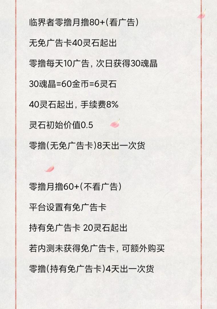 临界者玩法多样制造精美,每天零撸看广告获得30魂晶,锻造获得60金币,兑换6灵石价值3元。实名用户领取机甲,看10个广告开启产出,30天周期到期充能或升级。