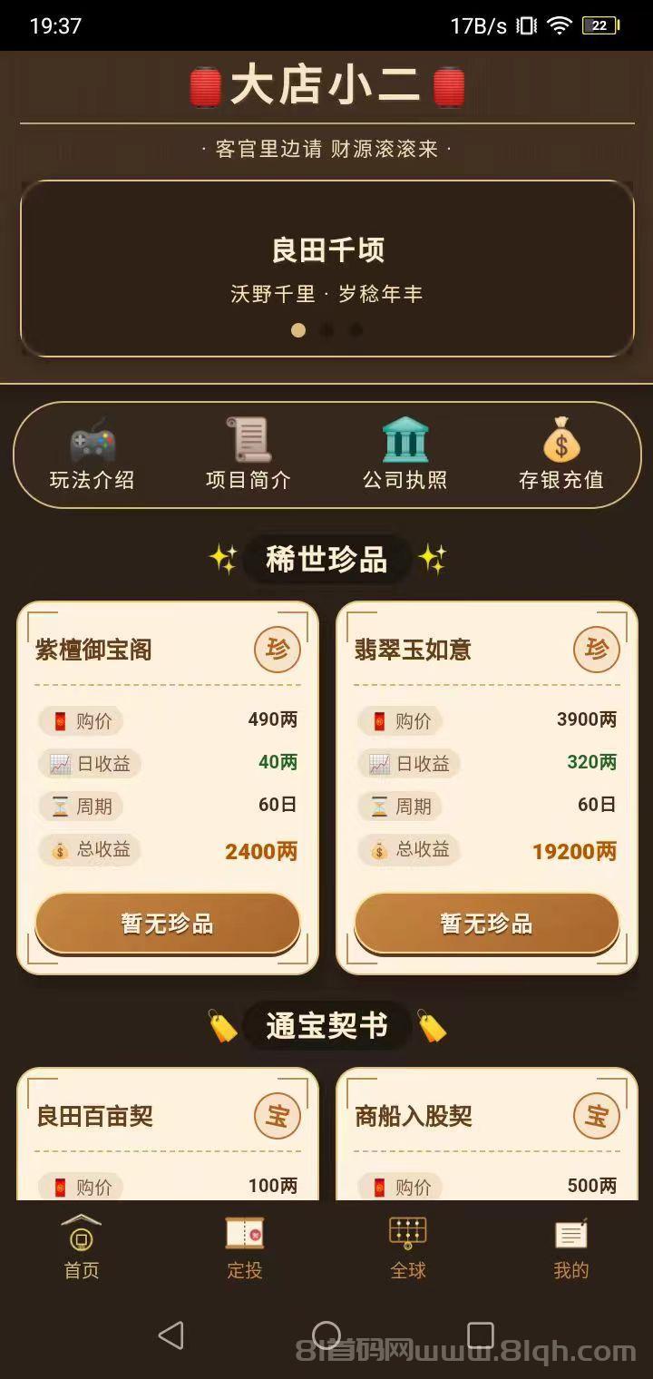 五谷丰登契200两到期收益320两。六畜兴旺契600两到期收益960两。织造坊月供1200两到期收益1980两。钱庄存本契2000两到期收益3300两。茶庄入股契3000两到期收益5100两。商号合伙契5000两到期收益8500两。定投模式到期一次性返还,收益放大适合长期布局。大店小二邀您共赴商海,日进斗金利泽长久。