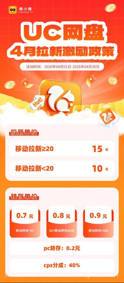 很多网盘拉新不分终端,但UC网盘明确区分移动和PC,移动端拉新最高15元/单,转存最高0.9元/次。