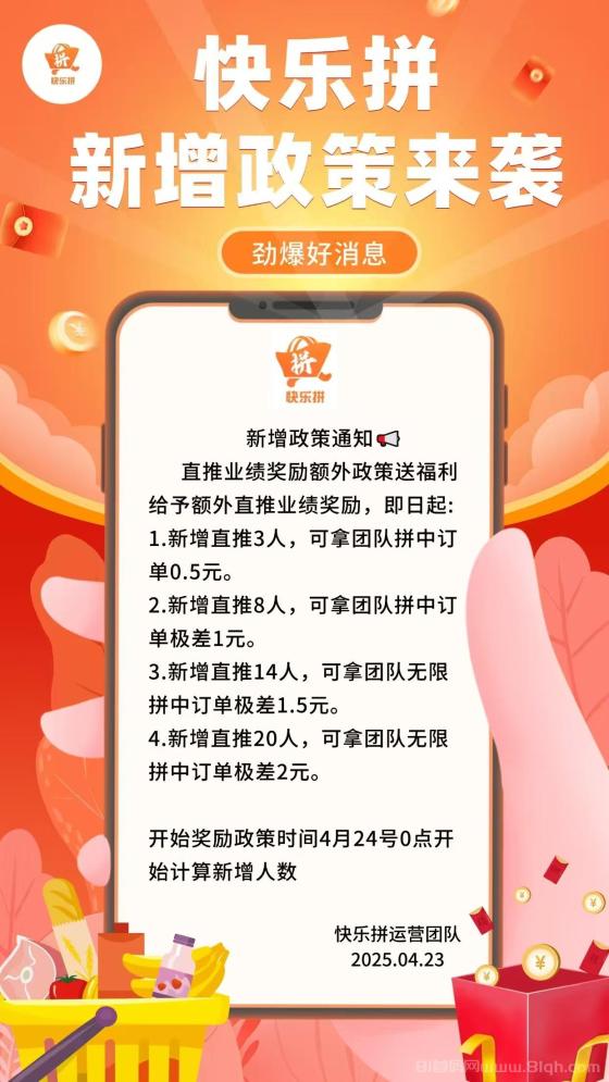 4月23日新增直推业绩奖励,新增直推人数达标,可拿团队拼中奖励,每单最高奖励2元。