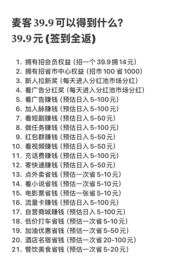 对接团队后,花费39元开通代理,即可享受最高等级待遇。推广新用户加入,可享受无限代40%的团队奖励,收益倍增。