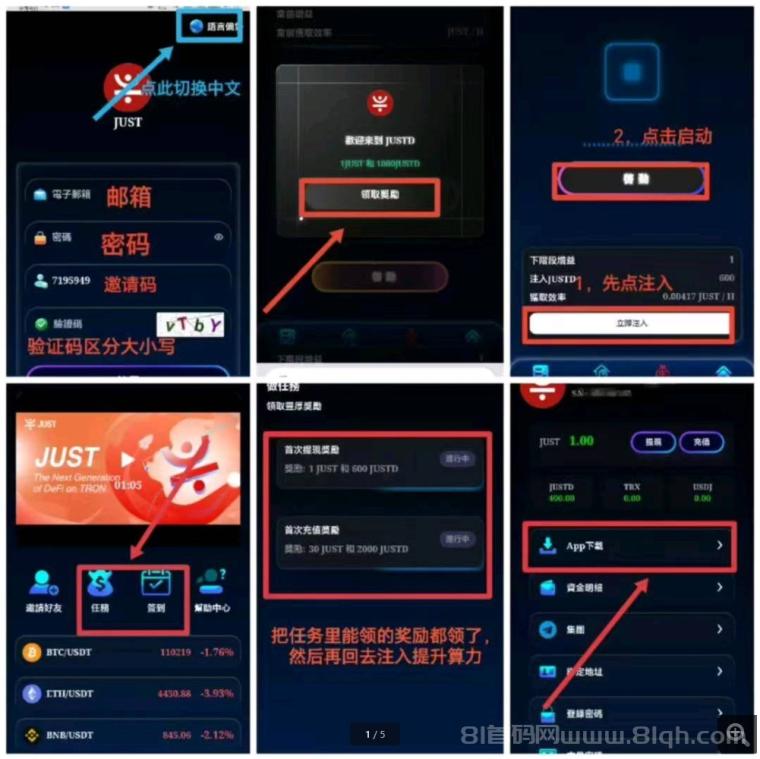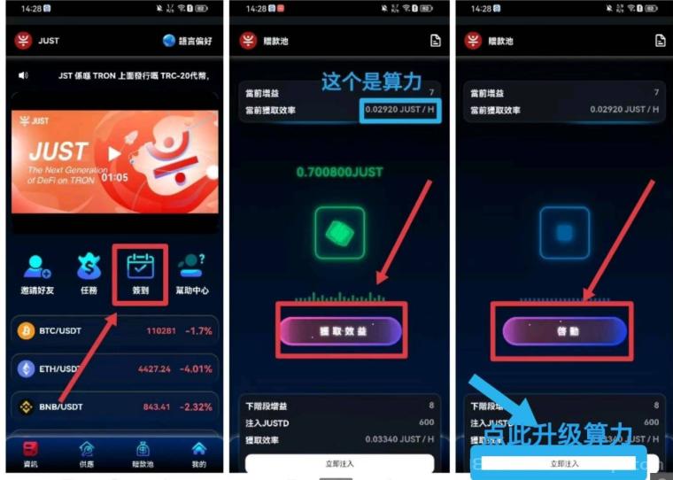 做任务和签到都能领取JUST 和 JUSTD,每天签到和领取收益即可,领取完记着点启动