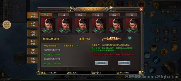 第一,佣兵系统赚钱。流程-一激活佣兵--补充活力每日扫荡一抽取心法-上架趣游宝库变现