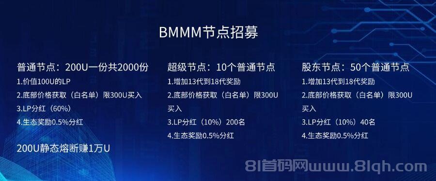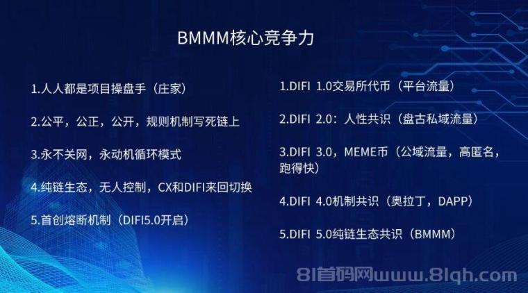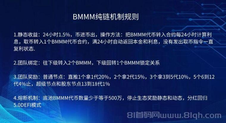 1.BMMM项目是由MMM爱好者为了致敬马夫罗伟大梦想而发起,核心价值观:真正实现全球去中心化金融,让全球MMM家人万倍回家
