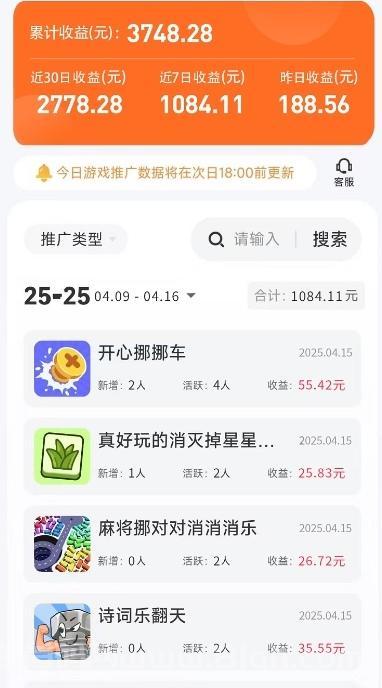 每半个小时-1个小时刷一轮,一共6轮,隔天显示收益。目前实测:单号单手机一天6个游戏36个广告刷满30-50块钱左右。