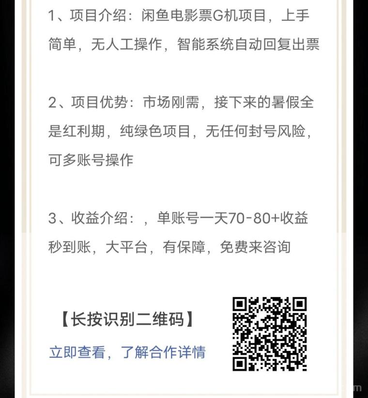 闲鱼自动化电影票G机项目,单账号日收益100+,市场刚需,收益秒到账。上手简单,无人工操作,智能系统自动回复出票,适合新手操作。