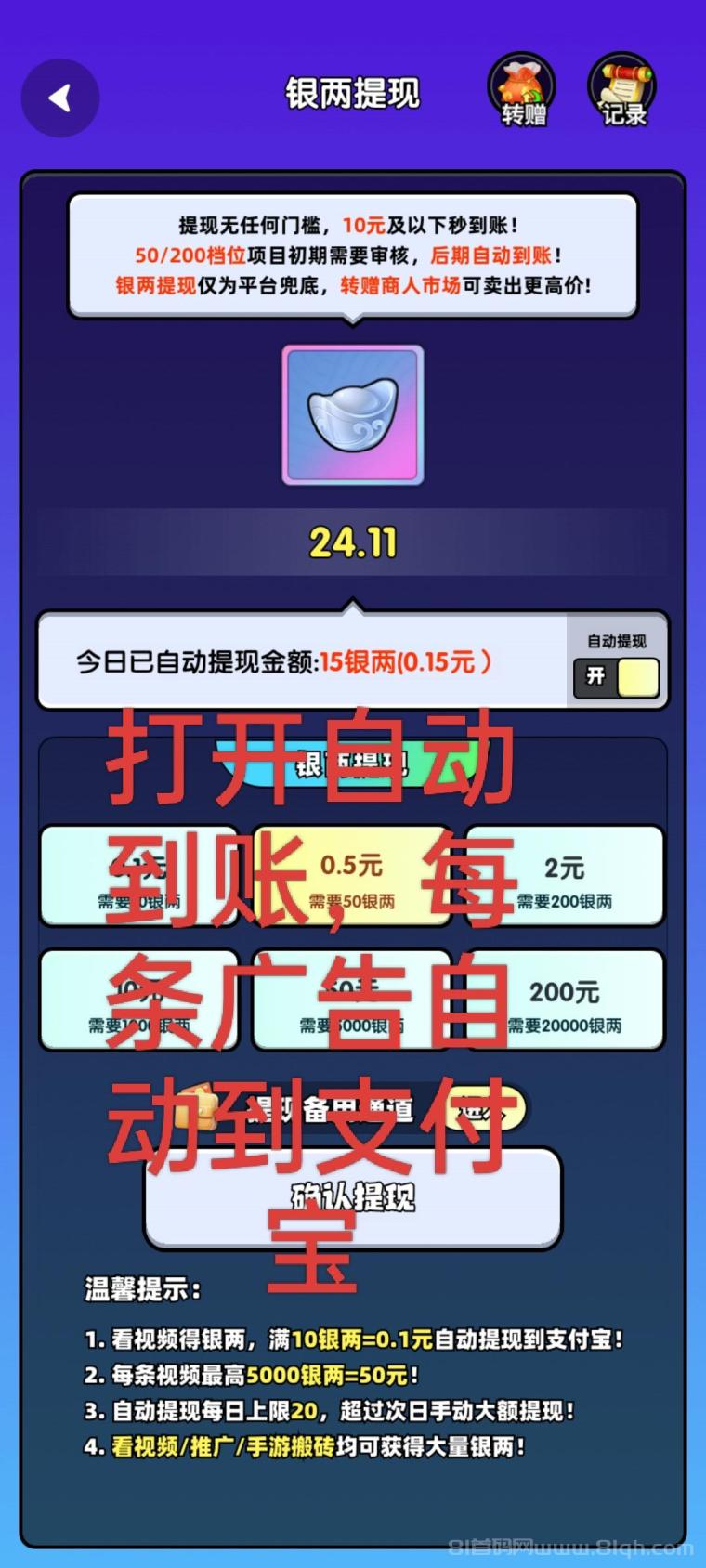 点击看广告,先下载全部应用(应用很小,45MB),然后逐个测试哪个给的银子多。100银子等于1元。