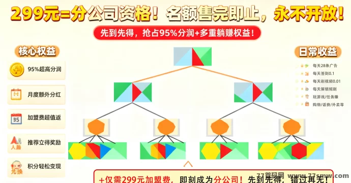 仅需299圆加盟费,即刻成为分公司!名额售完即止,永不开放,先到先得,抢占红利不等待!