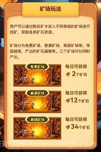 两个同级矿工拖一起,成功直升下一级,失败也不消失。普通到神话十个品阶,1级矿工日产10矿石,10级矿工日产破百,等级越高分奖越多。