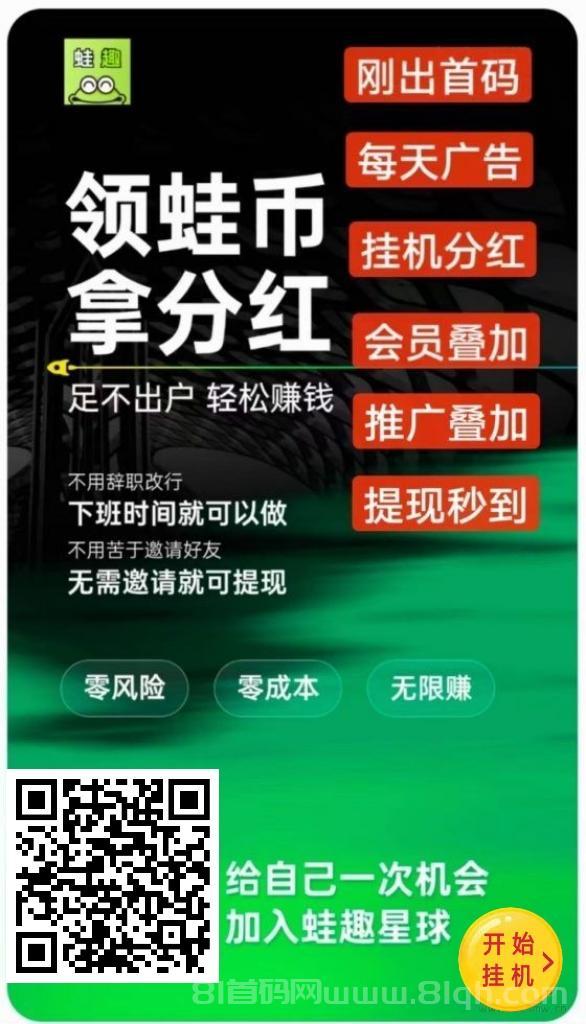 正文 蛙趣星球绿色挂机:日挂24元+推广翻倍,1000蛙币兑5元秒提 wmf5508 V评论者 /今天 /0 评论 /438 阅读 1125 文章最后更新时间2025年11月25日,若文章内容或图片失效,请留言反馈! 蛙趣星球公众号实名后挂机看广告自动领蛙币,1000蛙币=5元,每日轻松24元,推广两级阶梯积分叠加,会员收益翻倍,1元起提秒到微信。24元挂机秒到关注公众号实名即开,广告挂机蛙币实时到账,日挂24元,提现无门槛秒进。推广+会员翻倍两级邀请积分叠加,会员兑币比例更高,悬赏游戏任务再加分红,号多收益叠。 版权声明:本文内容由互联网用户自发贡献,该文观点仅代表作者本人。合作之前建议签订合同,本站仅提供信息存储空间服务,不拥有所有权,不承担相关法律责任。请勿盲目下载注册。若您不同意该提示,请关闭网页且不要在本站拓展任何合作,否则造成的任何损失由您个人承担。如发现本站有涉嫌抄袭侵权/违法违规的内容, 请发送邮件至:1442121520@qq.com