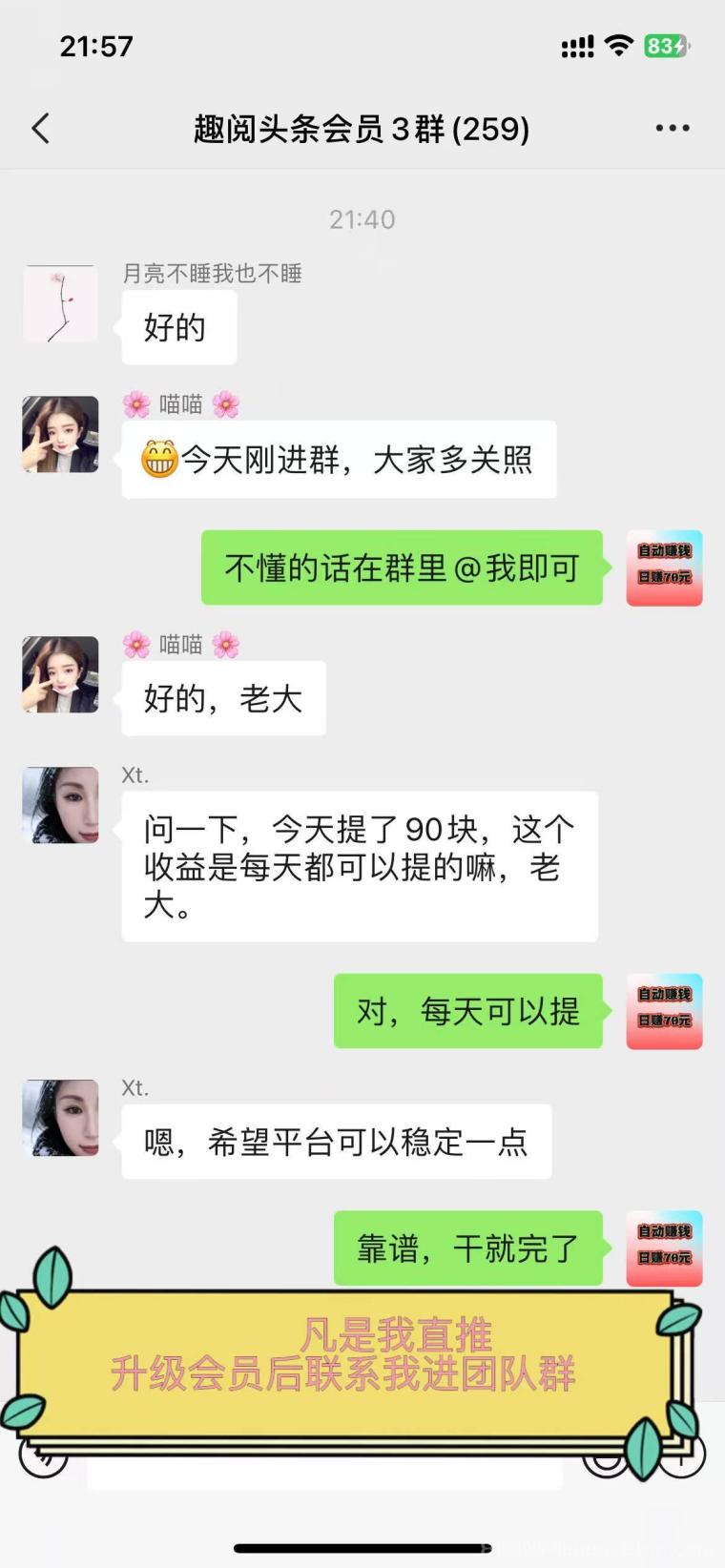 凡是我下级,升级会员后,联系我,我会马上拉你进专属团队群,和大家一起交流成长~群里不仅有和你同频的伙伴一起交流成长,能帮你更快跟上节奏、少走弯路。