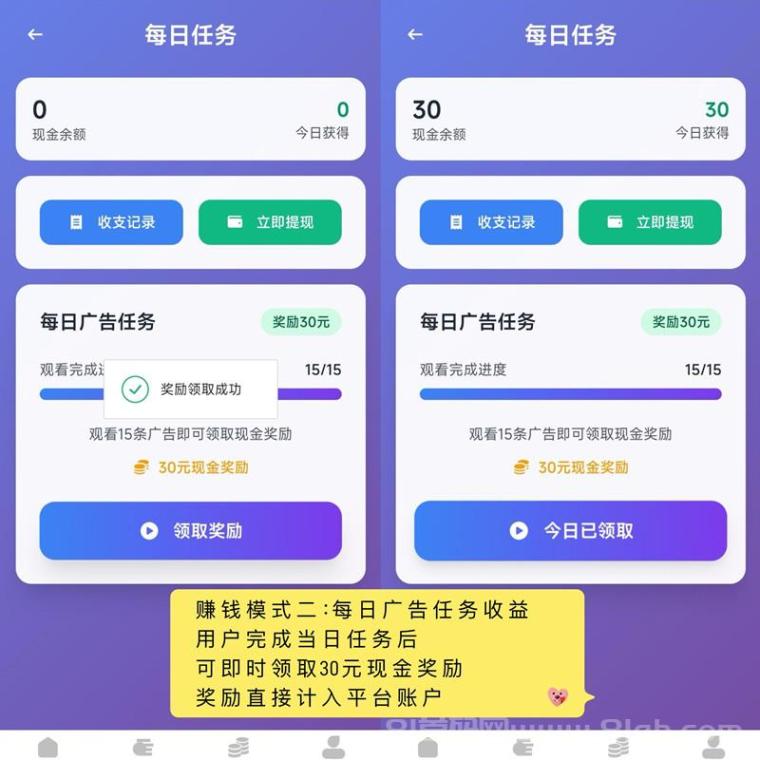 日看15条有效广告立得30元,进度自动记,单号日撸90元轻松。