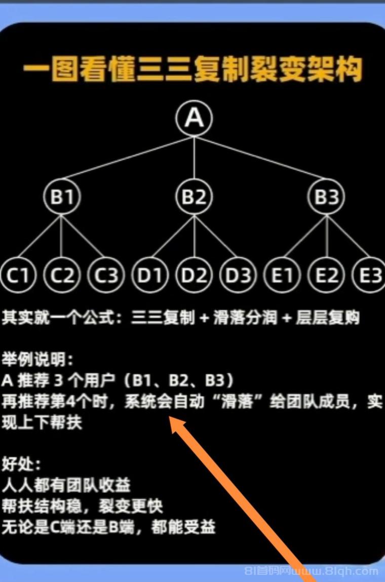 这种模式就是互帮互助,33复制自动滑落,上级帮下级铺满他的团队,然后下级看广告帮上级贡献收益,他们自己都会自觉的看广告,因为上级帮他铺满他的团队人数,他要看12条广告解锁网体收益,团队才能给到他贡献收益,希望大家多干直推你的团队才能裂变得更快,有上级滑落帮你推,有下级帮你推,你自己也在推,80万网体才能裂变得更快。