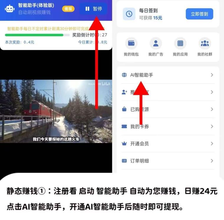 注册后启动智能助手,AI日赚28元,点击签到看激励视频广告,日兜底25元,无需实名认证即可提现。