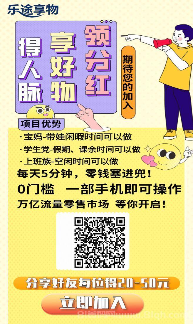 正文 乐途享物零撸上线:日领乐点换现金2026首码18号开抢 a360182307 V评论者 /今天 /0 评论 /389 阅读 0118 文章最后更新时间2026年01月18日,若文章内容或图片失效,请留言反馈! 乐途享物2026年1月18号正式上线,腾讯百度快手字节广告直供,零撸+投资+推广三通道,乐点每日生息,1元提现秒到,早布局早吃肉。流量零售机日撸20乐点首页一键开启流量零售机,睡觉也产20乐点,乐点当日直接换现金,数量越多分红越高,零门槛稳赚。15广告25乐点看爽再提任务中心每天15条广告25乐点,单条30秒,刷完立换零钱,多号多刷,碎片时间轻松日撸百元。推荐奖25-50元乐点永久抽拉好友做任务奖25-50元现金,下级每日领乐点你永久抽成,乐点后期可换家电、人脉,收入只涨不跌。 版权声明:本文内容由互联网用户自发贡献,该文观点仅代表作者本人。合作之前建议签订合同,本站仅提供信息存储空间服务,不拥有所有权,不承担相关法律责任。请勿盲目下载注册。若您不同意该提示,请关闭网页且不要在本站拓展任何合作,否则造成的任何损失由您个人承担。如发现本站有涉嫌抄袭侵权/违法违规的内容, 请发送邮件至:1442121520@qq.com