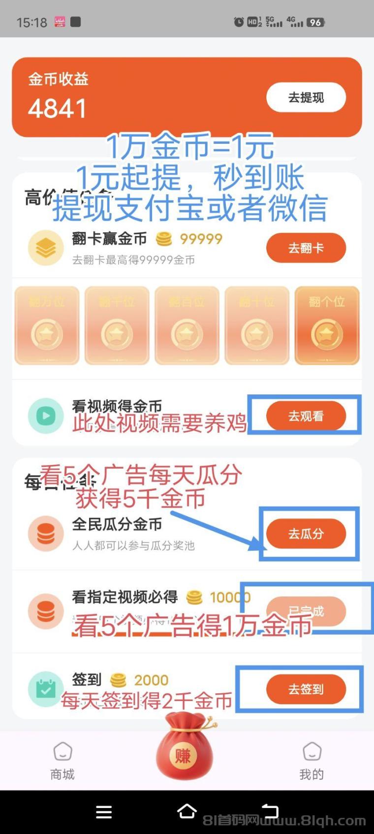 拾慧0撸看广告不养鸡:每日签到2000金币+5广告1万金币+邀请瓜分5000+金币1元起提秒到账