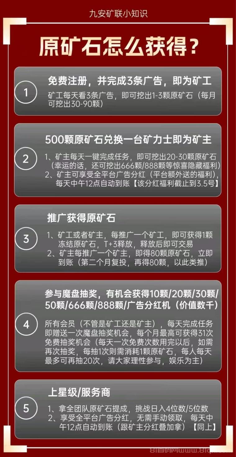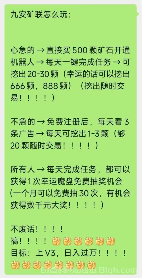 正文 久安平台绿色长久,每天稳定润米,可撸可投,黑马项目! 金豆队长 V评论者 /今天 /0 评论 /470 阅读 0227 文章最后更新时间2026年02月27日,若文章内容或图片失效,请留言反馈! 新春大吉,鸿运启市!正月初六(2月22日)正式开启挖矿,全网同步上线!邀请即送原矿石,注册每日完成简单广告任务,即可稳定产出原石,上线幸运抽奖转盘推广享团队奖励,星级达人享平台分红首码🔥九安矿联🉑撸🉑投第一个方案:每天看三个广告领取个矿机,看35天一次性领取500个币第二方案:投500米,每天21-30米左右,每天K机产出,包回收!收货热度非常高,要参与的尽快上车,零撸月收入高达一千零撸的话35天可以得到1000块左右服V:jindoumangguo 版权声明:本文内容由互联网用户自发贡献,该文观点仅代表作者本人。合作之前建议签订合同,本站仅提供信息存储空间服务,不拥有所有权,不承担相关法律责任。请勿盲目下载注册。若您不同意该提示,请关闭网页且不要在本站拓展任何合作,否则造成的任何损失由您个人承担。如发现本站有涉嫌抄袭侵权/违法违规的内容, 请发送邮件至:1442121520@qq.com