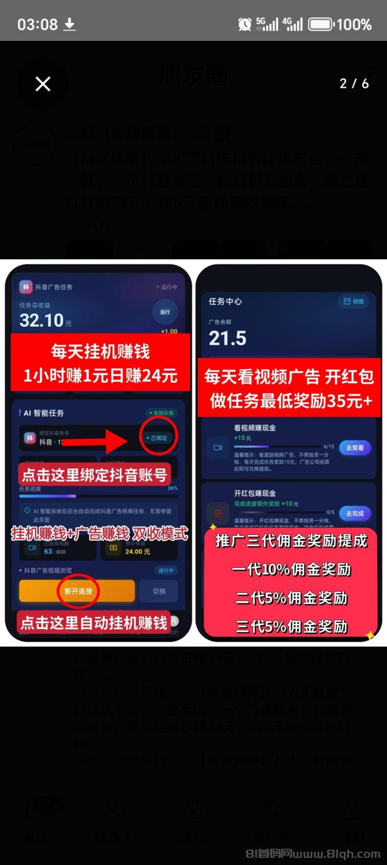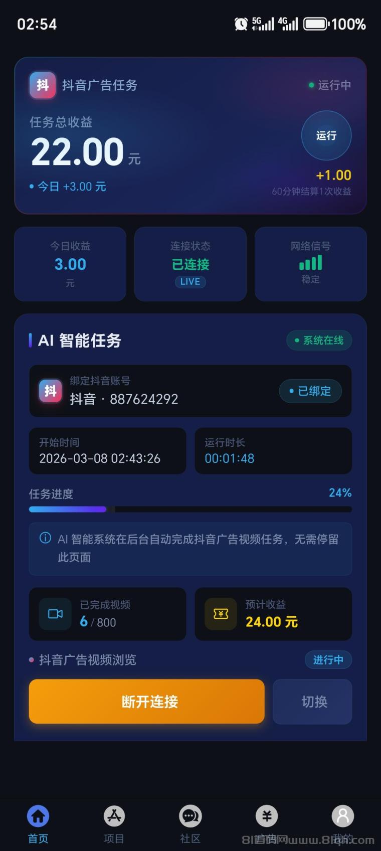抖客精灵是2026年新出的挂机项目,首码刚放出来。抖音号一键绑定就能开始挂机,进入平台主页自动运行,全程不用手动操作。系统自动完成看广告视频、刷赞、刷关这些任务,对抖音账号本身没有任何影响。单机一天保底24块钱,家里有多台手机的可以批量操作,收益直接翻倍。