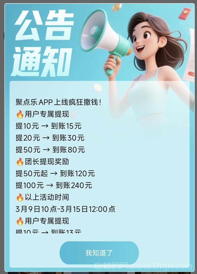 聚点乐提现补贴福利3月9日,3月15日用户提10实际到15元,提20实际到30元,提50实际到80元,3月16日,3月31日用户提10实际到13元,提20实际到26元,提50实际到65元后续还会有其他福利活动!