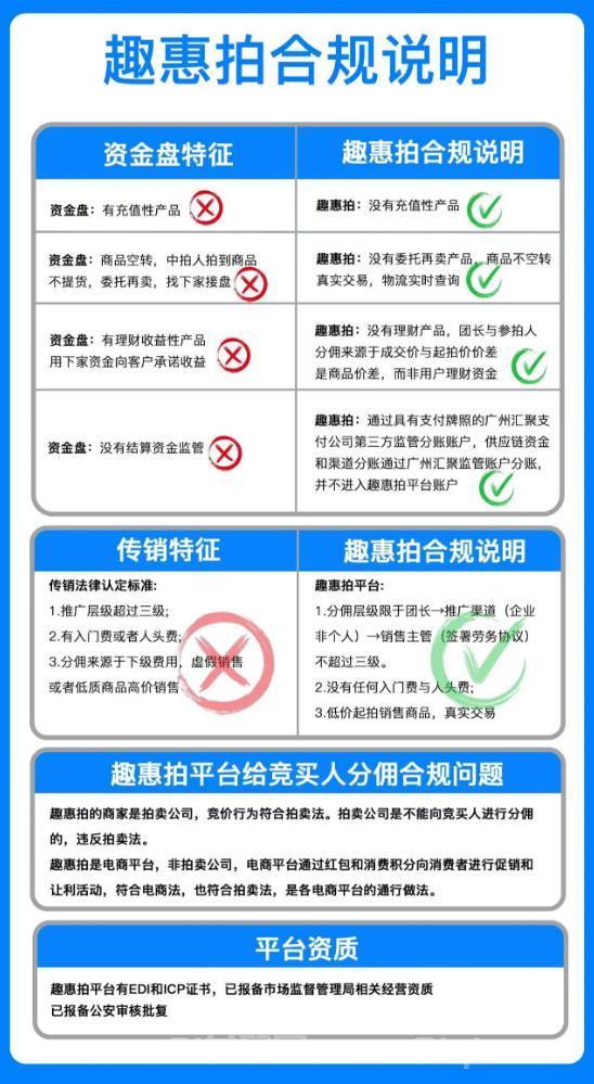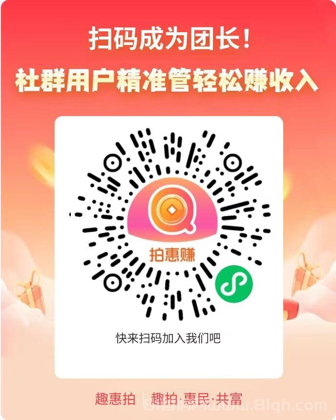 '趣惠拍”是快消品竞价+社交电商融合平台,将商品定价权交给消费者,旨在让消费者能够低价参拍商品。拍到省钱,拉动消费,加价分佣,拍不到赚钱。让想赚钱的居民群体通过推广运营能够获得收入。通过推广渠道、团长等岗位角色拉动社会就业,实现"趣拍·惠民·共赢"的企业愿景。