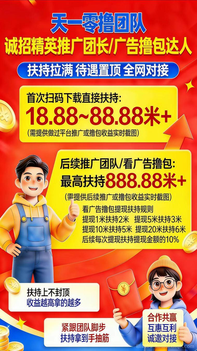 推广无线代收益,团长对接免费开通高级团长,发ID即可开通,你下级也管。首次扫码下载直接扶持18.88到388.88元,后续推广团队或看广告撸包最高扶持888.88元。