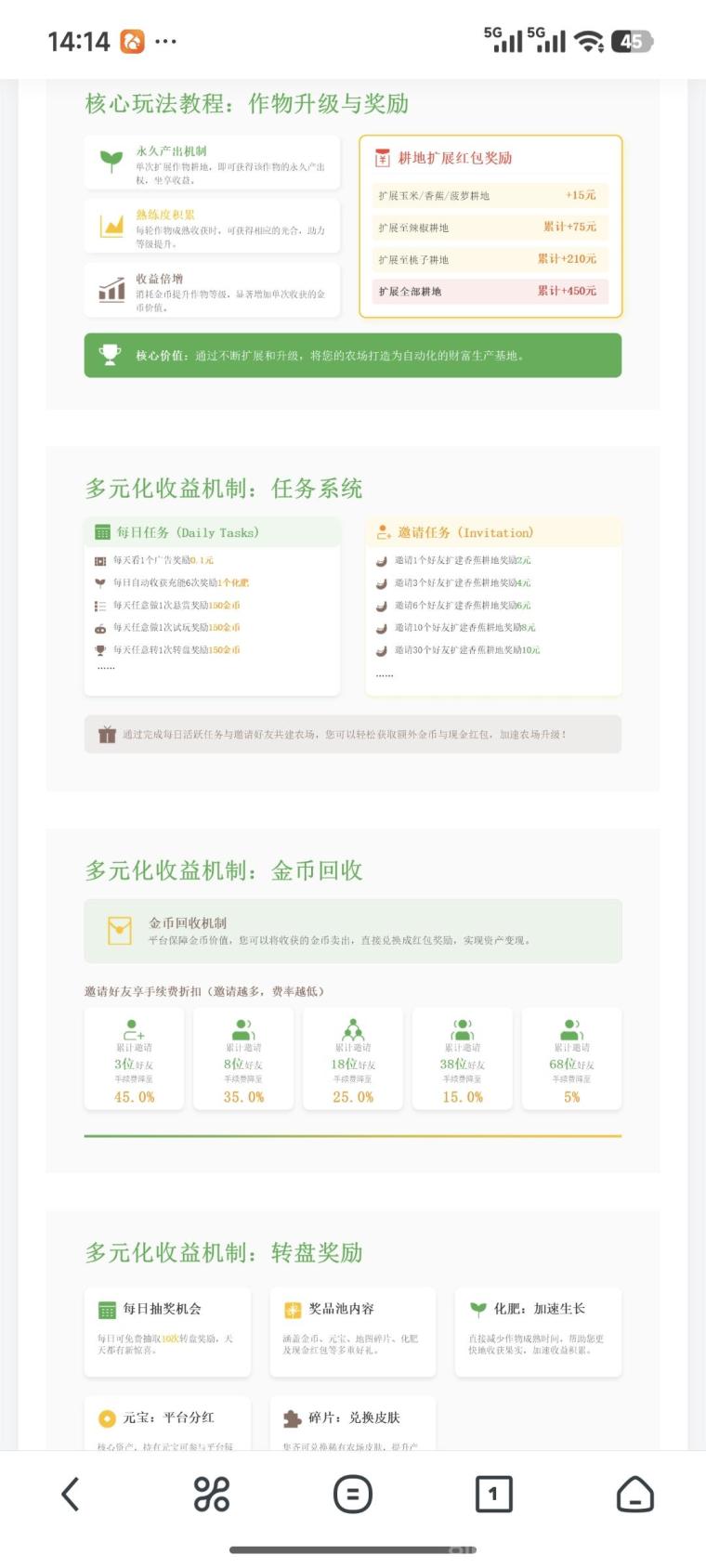 无需充值,无需投资,简单快捷,无脑挂机。注册免费开启耕地永久产金币,平台金币回收保底,1广告等于0.1元,最低0.1元起提秒到。