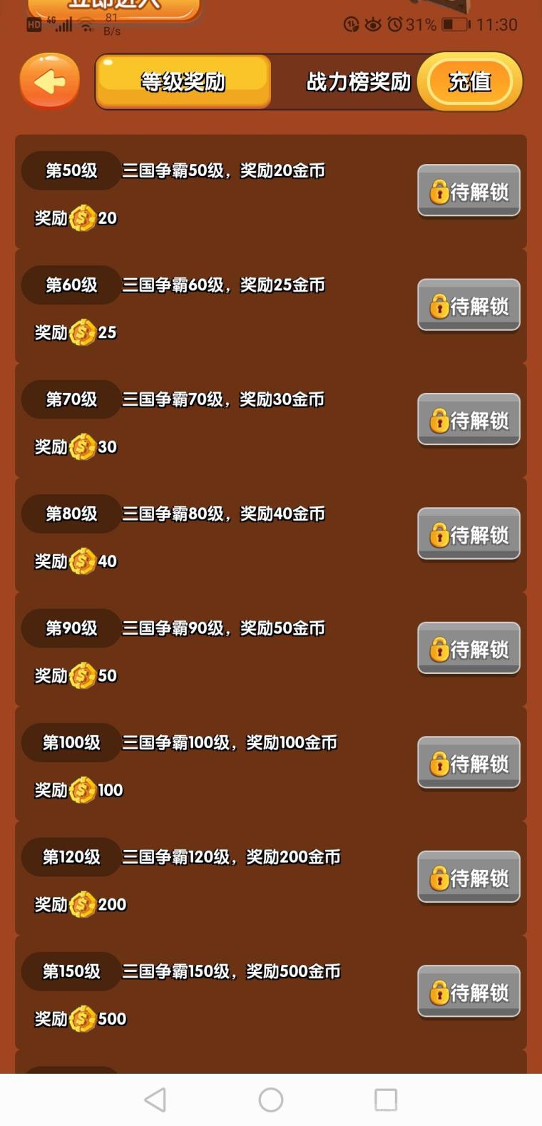 第三个是玩三国争霸,等级提升可以获得大量金币,进入排行榜能获取大量金币,是一个回合制的小游戏,有玩法引导,傻瓜式升级便可。