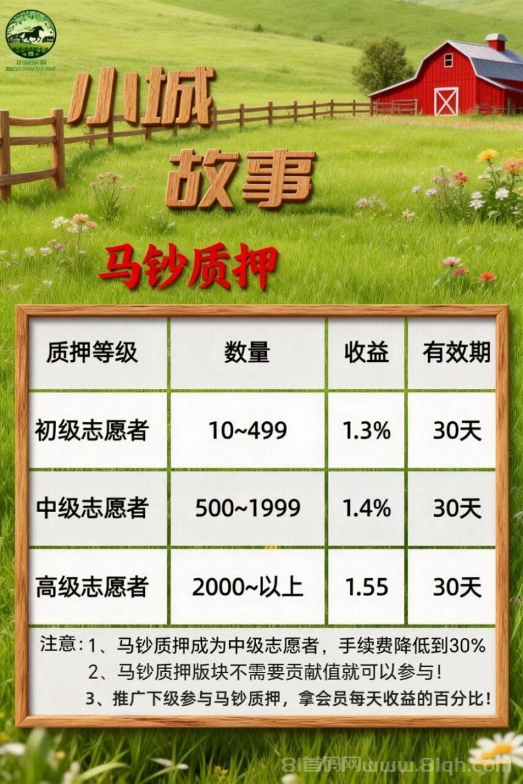 质押马钞升级中级志愿者,交易手续费直降至30%;下级质押马钞,上级可享质押比例收益,长期稳定赚复利