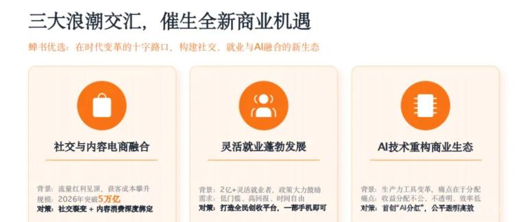 社交电商、灵活创业、AI 技术三大浪潮交汇,2026 年社交 + AI 融合电商规模将突破 5 万亿,超 2 亿灵活就业者,正迫切等待一个低门槛、高回报、时间自由的创富平台。 传统副业门槛高、收益低、模式枯燥、无法共享平台红利…… 普通人想增收,总是举步维艰。 蝉书优选由数来科技倾力打造,行业首创 AI 智能分红 + AI 视频带货双赋能,重新定义价值连接,打通创作者与用户闭环,让每一份贡献,都获得超值回报