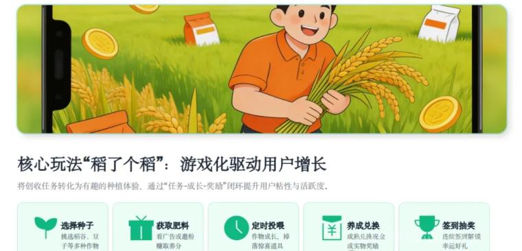 3. 游戏化激励独创「稻了个稻」玩法:选种子→赚肥料→养作物→兑奖励,把任务变游戏,娱乐中轻松赚收益。