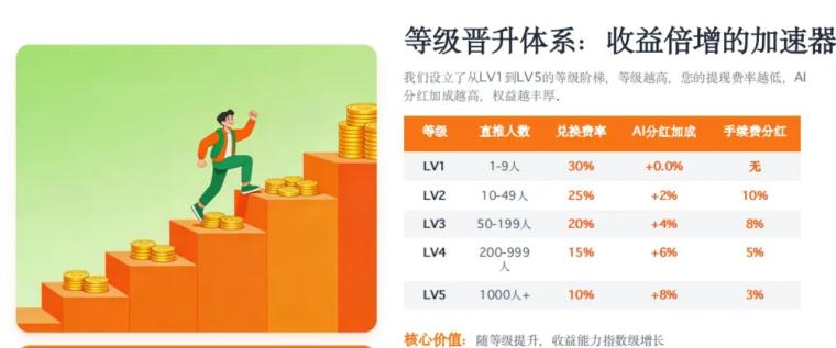 • 兑换费率越低(最低 10%) • AI 分红加成越高(最高 + 8%) • 手续费分红、专属权益同步升级 长期持有,资产价值持续攀升,收益上不封顶。