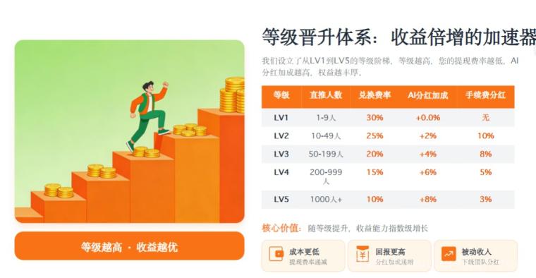 综合等级、粉丝量、活跃度、能量值精准计算分红权重每日盈利自动分配、多劳多得、实时到账团队越大、权重越高、收益越高,被动躺赚天花板!