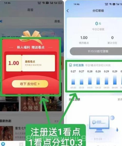 注册奖励:新人注册趣看短剧即送1看点,每日签到可获得0.1看点。