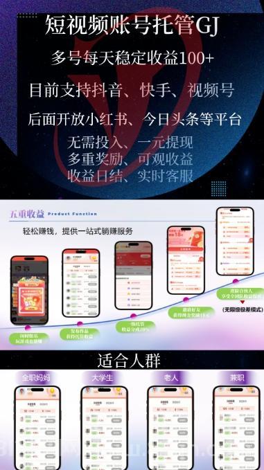 2.多样收益方式:平台新增了多种收益方式,包括娱乐、试玩、任务悬赏、签到赚钱等,收益不设上限,让你的收益翻倍增长。 3.双端托管:支持抖音与视频号双端托管,每日发布3-5条作品,让你的账号活跃度和收益双双提升。