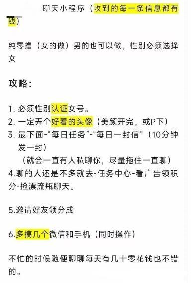 项目操作简单,无需任何难度,只要每天进入小程序进行聊天,就能轻松赚钱。注册不限男女,但性别必须填写为女,这样更容易赚取收益。