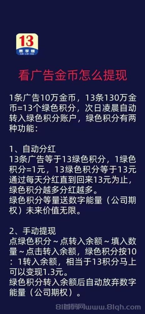 正文 13惠享赚:超强零撸,每日分红,早加入早受益 zhuzi123 V评论者 /2024-07-22 /0 评论 /7110 阅读 0722 此篇文章发布距今已超过510天,您需要注意文章的内容或图片是否可用! 13惠享赚平台,零撸赚钱,通过在APP首页观看广告并完成特定任务,用户可以轻松获得金币和积分,享受每日分红。平台特色亮点:广告观看:在APP首页观看广告,完成十三次广告观看即可获得金币奖励。积分分红:凌晨自动将金币转换为积分,每13个积分可兑换1元,分红一比一扣除,即扣除一个积分等于获得一块钱。积分交易系统:即将上线的积分交易系统将由官方提供保底回收,保证用户资产的安全。绿色能力:金币可一比一转化为积分,购物时也能获得积分,增加用户的收益。团队邀请:邀请13个人加入,即可获得公排团队,享受团队分红。零撸福利:完成零撸任务,绿色能力将等同于后期的股份,为用户带来长期的收益。APP进群找我拿 版权声明:本文内容由互联网用户自发贡献,该文观点仅代表作者本人。合作之前建议签订合同,本站仅提供信息存储空间服务,不拥有所有权,不承担相关法律责任。请勿盲目下载注册。若您不同意该提示,请关闭网页且不要在本站拓展任何合作,否则造成的任何损失由您个人承担。如发现本站有涉嫌抄袭侵权/违法违规的内容, 请发送邮件至:1442121520@qq.com
